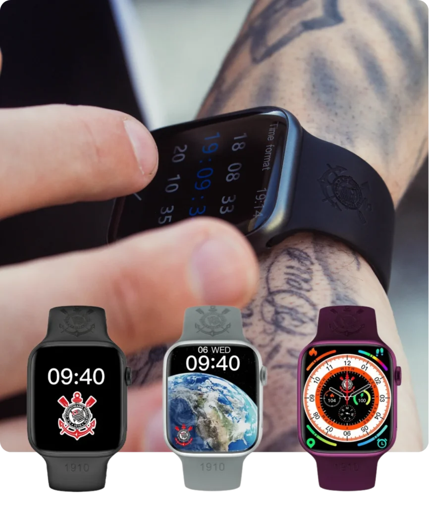 Menu inteligente, mostradores personalizados e pulseira fácil de trocar.