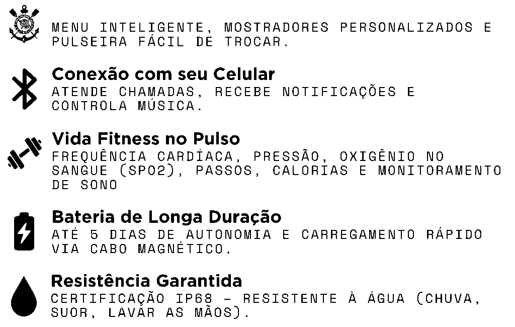 Frequência cardíaca, pressão, oxigênio no sangue (SpO2), passos, calorias e monitoramento de sono